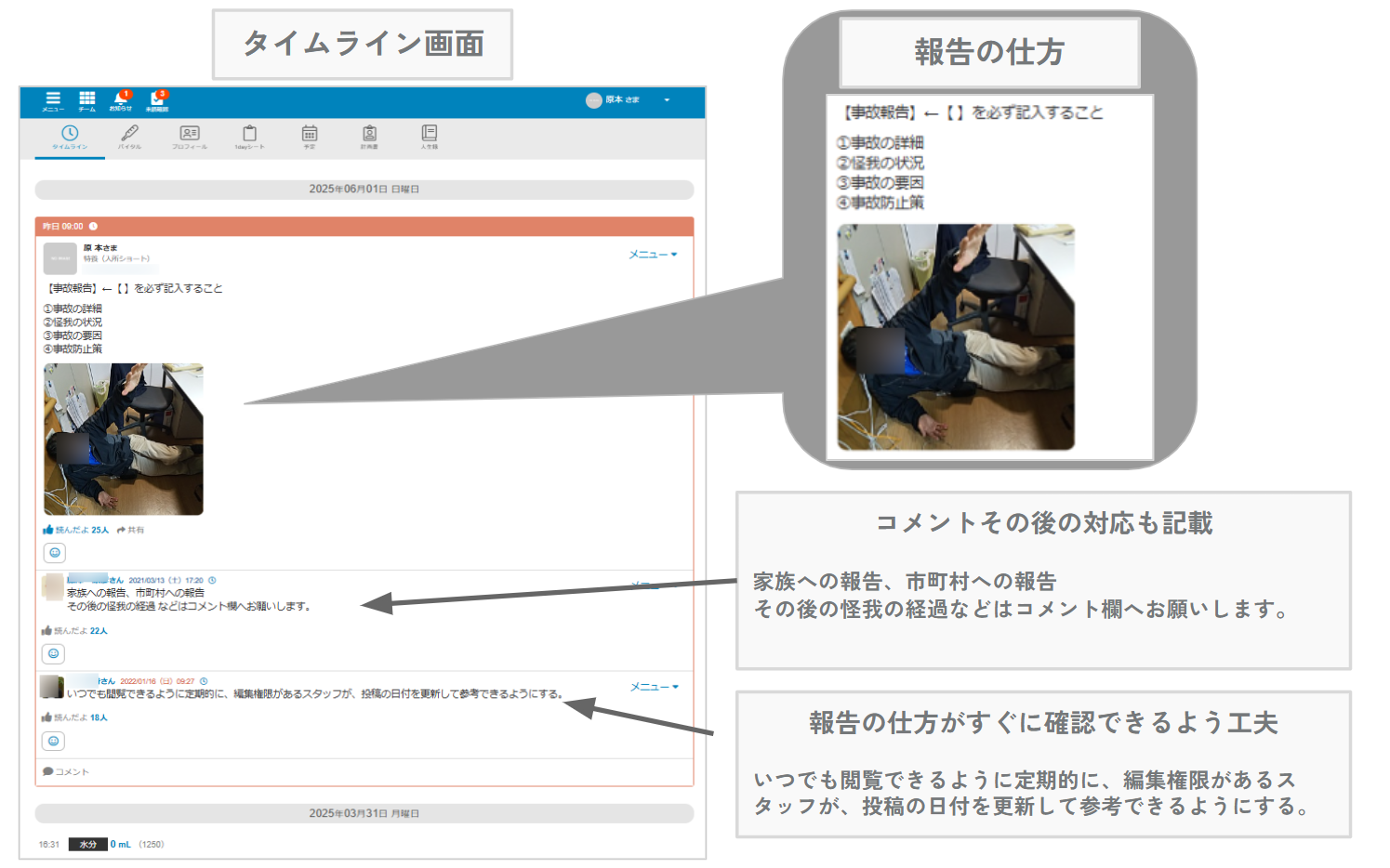 原本さまのタイムラインのトップに事故報告のテンプレートがくるように設定しています。また1dayシートに新規のご利用者さんの1dayシートのテンプレートを作成しています。