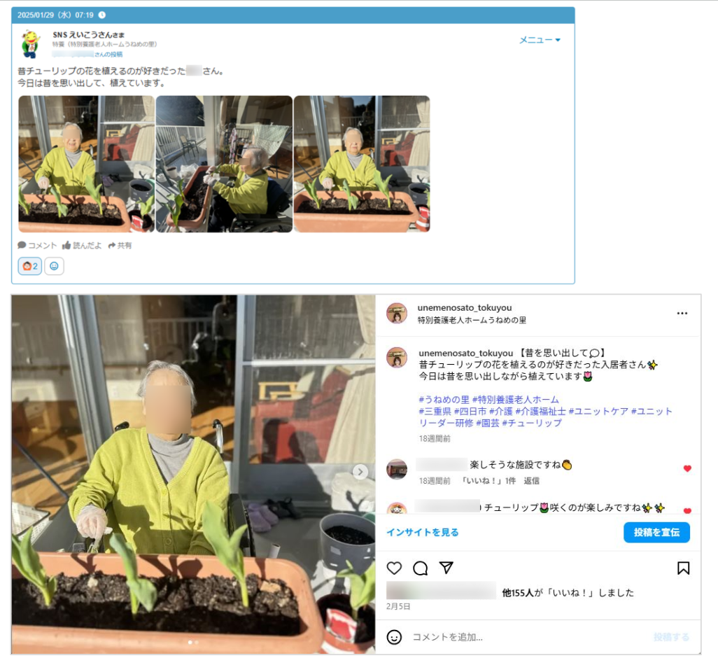 「SNSえいこうさん」に、SNS(特にInstagram)で発信する法人紹介用の写真データを一元的に保存しています。これにより、職員はSNSえいこうのページから必要な写真を簡単に探し出し、効率的に情報発信を行うことができています。