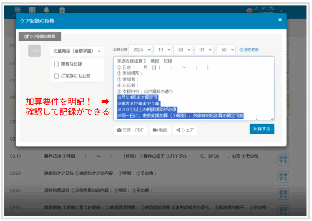 加算の記録も、取りこぼしが無いように1dayシートに登録しています。工夫しているポイントは、加算取得の要件まで1dayシートに登録していることです。記録時に確認ができることで、新人スタッフ含め誰もが加算に対応した記録が書けています。