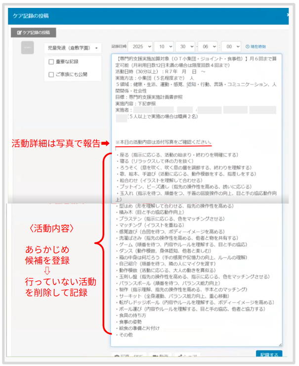 活動内容も、実施する可能性がある活動名をあらかじめ登録しておいて、記録する時にやらなかった内容を削除して記録しています。色々試した結果、この方法が一番早いと感じています。