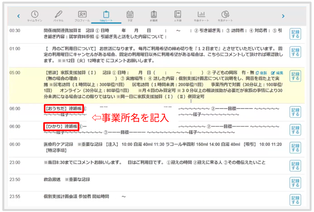法人内で複数事業所併用されているご利用者もいるので、1dayシートの頭に【事業所名】を登録してわかりやすくしています。