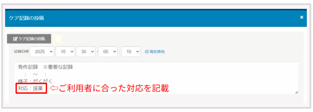 同じてんかん発作でも、発作が起きた時の対応がご利用者によって異なるので、1dayシートに「対応」として登録しています。