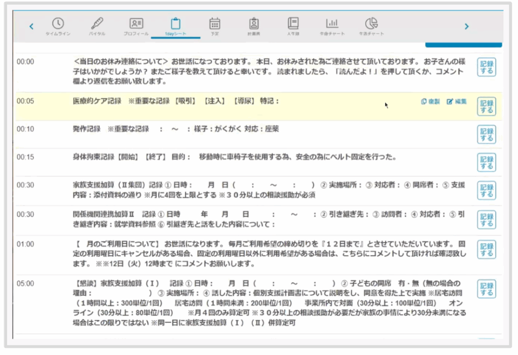 吸引をしたのか、注入をしたのか、発作は何回か、等必要な情報をしっかり記録に残せるように1dayシートに項目を登録しています。