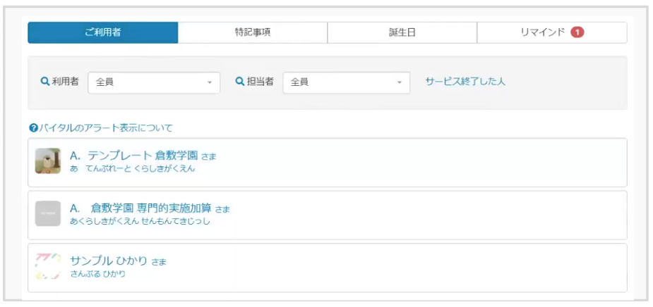 事業所で共通して記録する内容は、情報ごとに架空のご利用者の1dayシートに登録しています。連絡帳や、園便りなどの記録は「テンプレート倉敷学園」さん、専門職の実施記録は「倉敷学園 専門的実施加算」さんに登録しています。記録する時は、該当するご利用者にシェア記録で記録しています。
