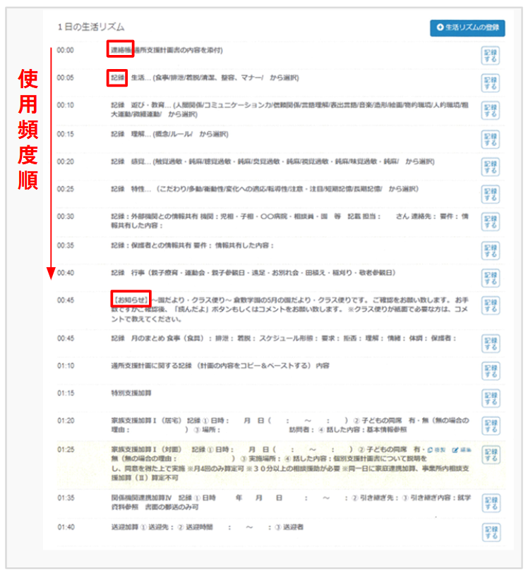 生活リズムの冒頭には、記録の種類を入力しています。ご家族へ公開するもは【お知らせ】、公開しないものは’記録’などです。また、登録時間を活用して、上から順に使用頻度順で並び変えています。