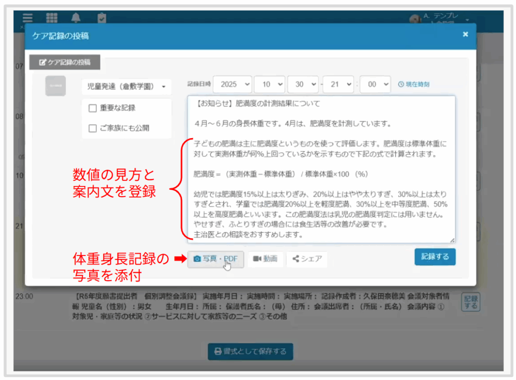 ケアコラボを活用する一方で、紙で記録したほうが早いものもあると思っていて、身長体重などのバイタルは、紙に記録しています。数値の見方がわかるような案内文をあらかじめ1dayシートに登録しているので、1dayシートから体重身長記録の写真を添付してご家族へ記録を公開することで、効率的に情報共有が出来ます。
