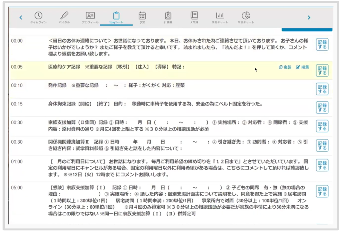 吸引をしたのか、注入をしたのか、発作は何回か、等必要な情報をしっかり記録に残せるように1dayシートに項目を登録しています。