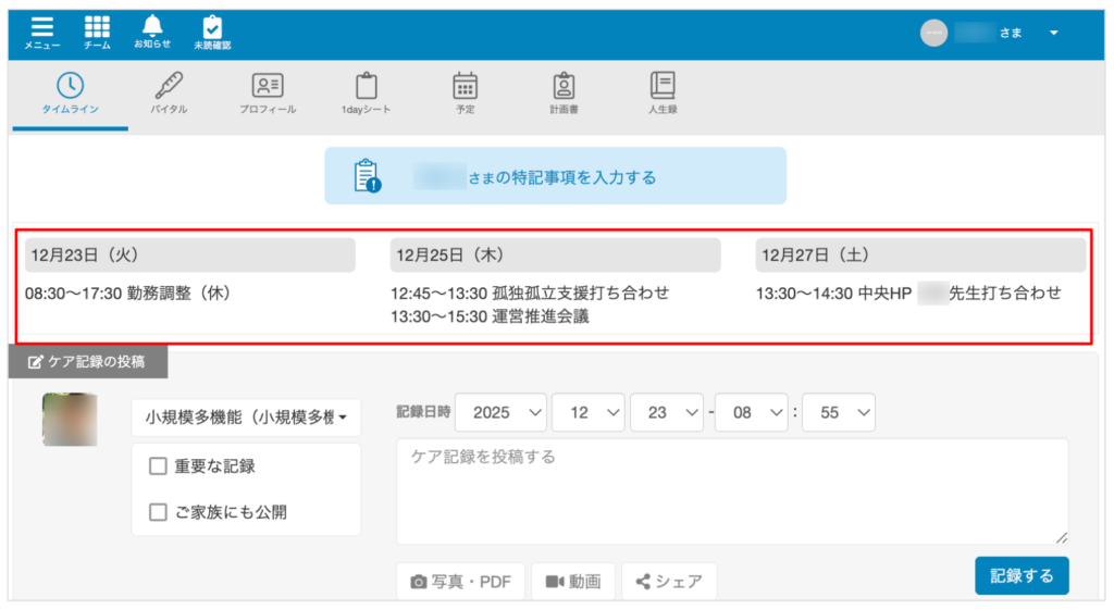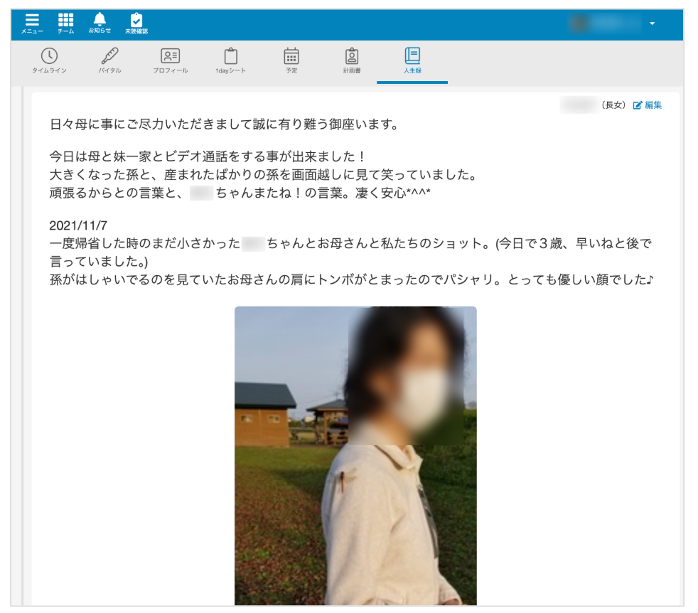 ご利用者様が、過去どのように暮らしていたのかということを知るための場所として利用しています。スタッフが把握している情報を記録するのはもちろんですが、ご家族だからこそ知っているエピソードを写真付きで投稿してくださることもあります。それがきっかけで、ご利用者様との会話が弾んだり、新しい話題に繋がったりすることもあります。