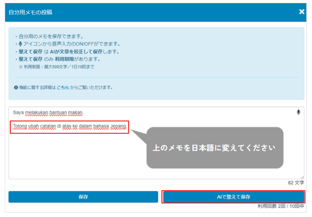 メモ機能に母国語で音声もしくはタイピングで記録したい内容を入力後、母国語で「上のメモを日本語に変えてください」と指示を入れて「AIで保存」をすることで、簡単に日本語の記録が出来上がります。