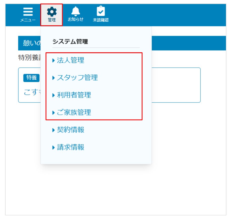 1.~ 4. の権限については、権限が付与されていると、メニューの「システム管理」に該当の項目が表示されます。