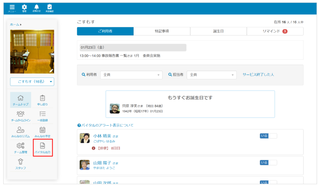 6. バイタルデータのダウンロード権限 が付与されている場合は、チームメニュー に、「バイタル出力」が表示されます。